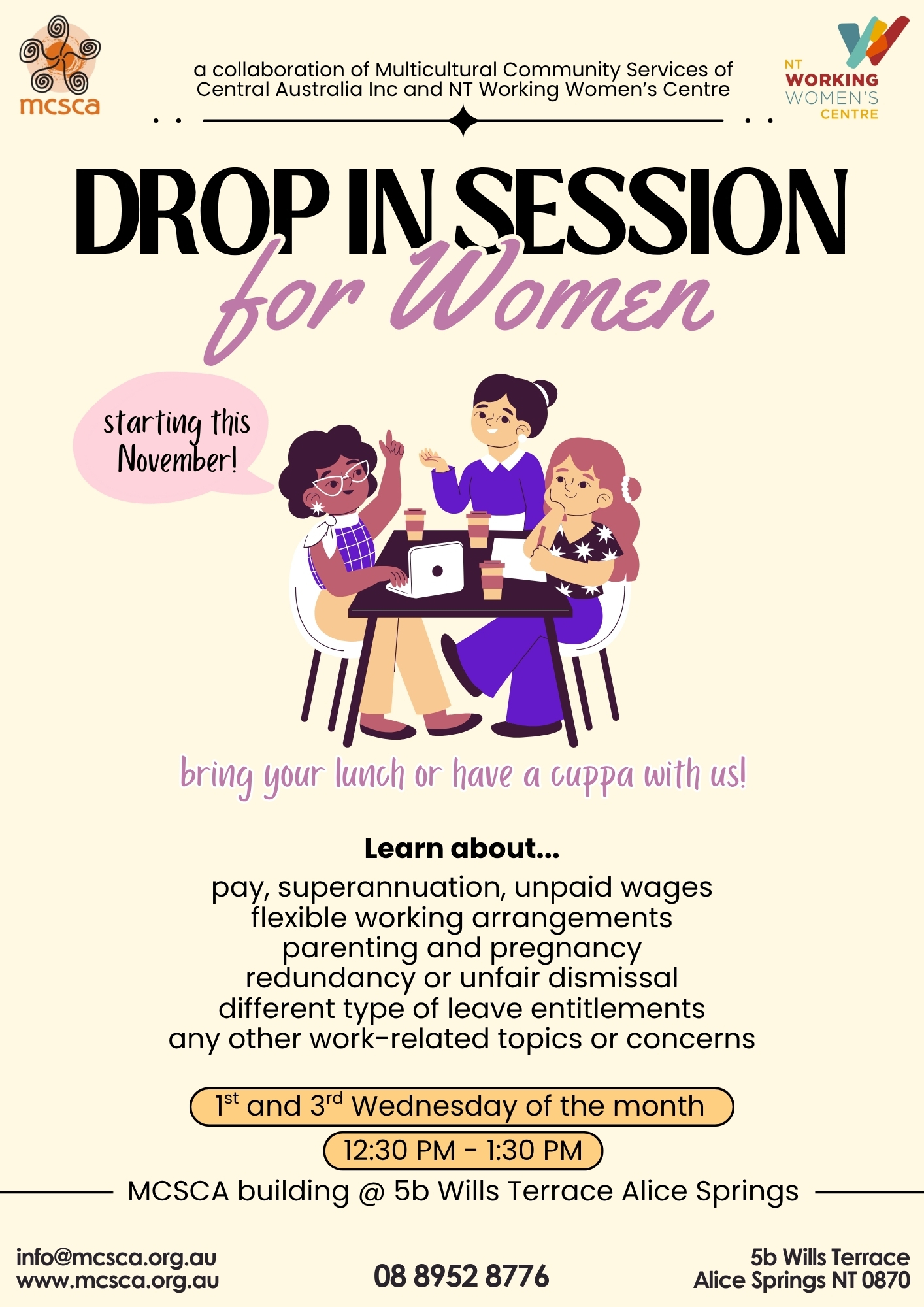 We have teamed up with Multicultural Community Services of Central Australia (MCSCA) to host lunch and learn drop-in sessions for women — all about your workplace rights!